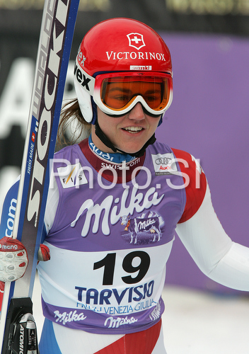 : Second placed Fabienne Suter of Switzerland reacts in finish of Women Super-G race of Tarvisio Audi FIS Ski World Cup 2008-09. Downhill race of Women Audi FIS Ski World Cup 2008-09 was held in Tarvisio, Italy on Sunday, 22nd of February 2009.