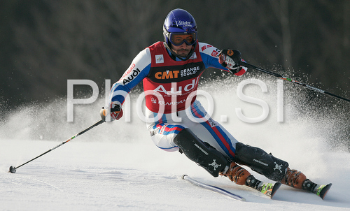 : Tenth placed after first run Jean-Baptiste Grange of France skiing in first run of Men slalom race of Kranjska Gora Audi FIS Ski World Cup 2008-09. Slalom race of Men Audi FIS Ski World Cup 2008-09 was held in Kranjska Gora, Slovenia, on Sunday, 1st of February 2009.