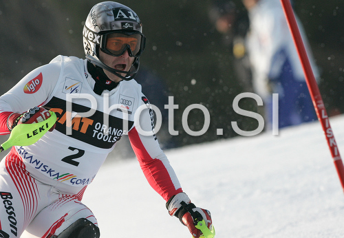 : Second placed after first run Reinfried Herbst of Austria skiing in first run of Men slalom race of Kranjska Gora Audi FIS Ski World Cup 2008-09. Slalom race of Men Audi FIS Ski World Cup 2008-09 was held in Kranjska Gora, Slovenia, on Sunday, 1st of February 2009.