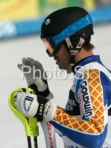 : Ninth placed Andre Myhrer of Sweden reacts in finish of second run of Men slalom race of Kranjska Gora Audi FIS Ski World Cup 2008-09. Slalom race of Men Audi FIS Ski World Cup 2008-09 was held in Kranjska Gora, Slovenia, on Sunday, 1st of March 2009.