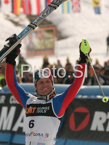 Kranjska Gora ,Slovenia - 01.03.2009 : Winner Julien Lizeroux of France celebrates his medal won in Men slalom race of Kranjska Gora Audi FIS Ski World Cup 2008-09. Slalom race of Men Audi FIS Ski World Cup 2008-09 was held in Kranjska Gora, Slovenia, on Sunday, 1st of March 2009. Photo by: Primoz Jeroncic
