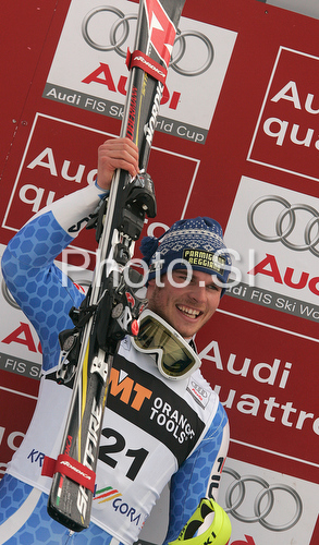 : Second placed Giuliano Razzoli of Italy celebrates his medal won in Men slalom race of Kranjska Gora Audi FIS Ski World Cup 2008-09. Slalom race of Men Audi FIS Ski World Cup 2008-09 was held in Kranjska Gora, Slovenia, on Sunday, 1st of March 2009.