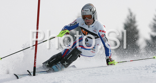 : Winner Julien Lizeroux of France skiing in second run of Men slalom race of Kranjska Gora Audi FIS Ski World Cup 2008-09. Slalom race of Men Audi FIS Ski World Cup 2008-09 was held in Kranjska Gora, Slovenia, on Sunday, 1st of March 2009.