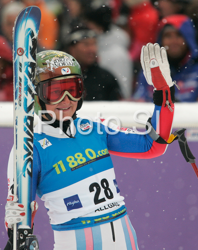 : Olivia Bertrand of France reacts in finish of second run of Women giant slalom race of Ofterschwang Audi FIS Ski World Cup 2008-09. Giant slalom race of Women Audi FIS Ski World Cup 2008-09 was held in Ofterschwang, Germany, on Friday, 6th of March 2009.