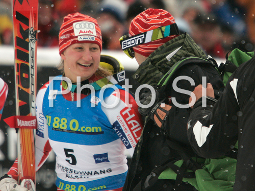 : Third placed Tanja Poutiainen of Finland (L) celebrates her medal won in Women giant slalom race of Ofterschwang Audi FIS Ski World Cup 2008-09 together with her coach Janez Slivnik (R). Giant slalom race of Women Audi FIS Ski World Cup 2008-09 was held in Ofterschwang, Germany, on Friday, 6th of March 2009.