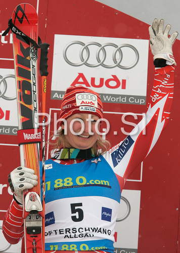 : Third placed Tanja Poutiainen of Finland celebrates her medal won in Women giant slalom race of Ofterschwang Audi FIS Ski World Cup 2008-09. Giant slalom race of Women Audi FIS Ski World Cup 2008-09 was held in Ofterschwang, Germany, on Friday, 6th of March 2009.