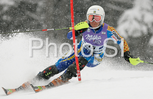 : Fifth placed after first run Frida Hansdotter of Sweden skiing in first run of Women slalom race of Ofterschwang Audi FIS Ski World Cup 2008-09. Slalom race of Women Audi FIS Ski World Cup 2008-09 was held in Ofterschwang, Germany, on Saturday, 7th of March 2009.