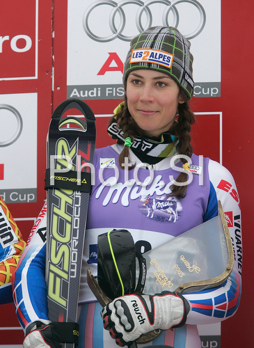 : Winner Sandrine Aubert of France celebrates her medal won in Women slalom race of Ofterschwang Audi FIS Ski World Cup 2008-09. Slalom race of Women Audi FIS Ski World Cup 2008-09 was held in Ofterschwang, Germany, on Saturday, 7th of March 2009.