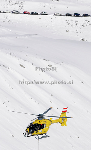 : Rescue helicopter flying to pick injured Nicole Hosp of Austria who got injured after falling in first run of first Women GS FIS Alpine ski World Cup 2009-2010 race in Soelden, Austria. First giant slalom race of Women FIS Alpine ski World Cup was held on Rettenbach glacier above Soelden, Austria on 24th of October 2009.