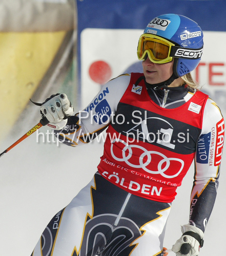 : Winner Tanja Poutiainen of Finland reacts in finish of second run of first Women GS FIS Alpine ski World Cup 2009-2010 race in Soelden, Austria. First giant slalom race of Women FIS Alpine ski World Cup was held on Rettenbach glacier above Soelden, Austria on 24th of October 2009.
