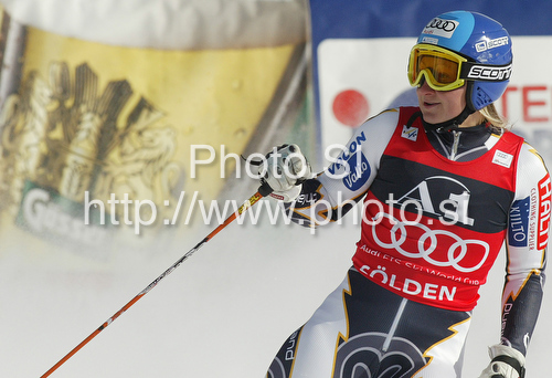 : Winner Tanja Poutiainen of Finland reacts in finish of second run of first Women GS FIS Alpine ski World Cup 2009-2010 race in Soelden, Austria. First giant slalom race of Women FIS Alpine ski World Cup was held on Rettenbach glacier above Soelden, Austria on 24th of October 2009.