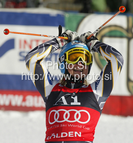 : Winner Tanja Poutiainen of Finland reacts in finish of second run of first Women GS FIS Alpine ski World Cup 2009-2010 race in Soelden, Austria. First giant slalom race of Women FIS Alpine ski World Cup was held on Rettenbach glacier above Soelden, Austria on 24th of October 2009.