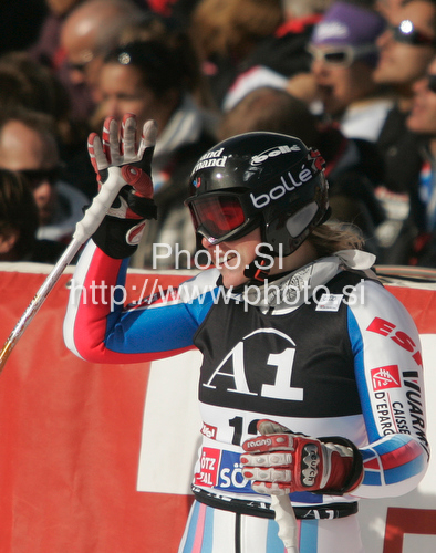: Tessa Worley of France reacts in finish of second run of first Women GS FIS Alpine ski World Cup 2009-2010 race in Soelden, Austria. First giant slalom race of Women FIS Alpine ski World Cup was held on Rettenbach glacier above Soelden, Austria on 24th of October 2009.