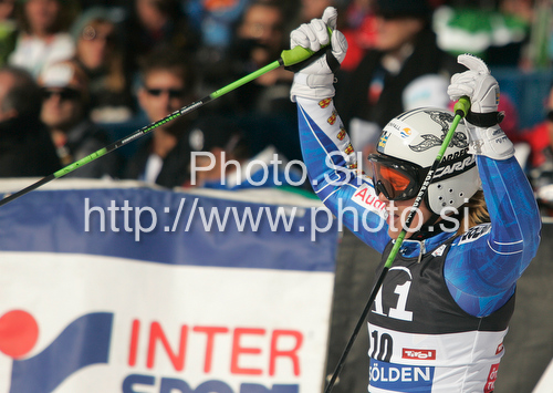: Anja Paerson of Sweden reacts in finish of second run of first Women GS FIS Alpine ski World Cup 2009-2010 race in Soelden, Austria. First giant slalom race of Women FIS Alpine ski World Cup was held on Rettenbach glacier above Soelden, Austria on 24th of October 2009.