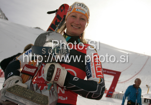: Winner Tanja Poutiainen of Finland celebrates her medal won in first Women GS FIS Alpine ski World Cup 2009-2010 race in Soelden, Austria. First giant slalom race of Women FIS Alpine ski World Cup was held on Rettenbach glacier above Soelden, Austria on 24th of October 2009.