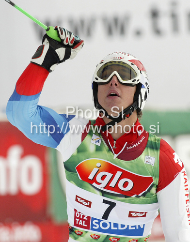: Third placed Carlo Janka of Switzerland reacts in finish of second run of first Men GS FIS Alpine ski World Cup 2009-2010 race in Soelden, Austria. First giant slalom race of Men FIS Alpine ski World Cup was held on Rettenbach glacier above Soelden, Austria on 25th of October 2009.