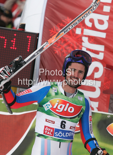 : Seventh placed Jean-Baptiste Grange of France reacts in finish of second run of first Men GS FIS Alpine ski World Cup 2009-2010 race in Soelden, Austria. First giant slalom race of Men FIS Alpine ski World Cup was held on Rettenbach glacier above Soelden, Austria on 25th of October 2009.