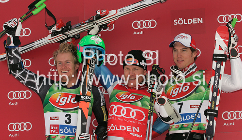 : Winner Didier Cuche of Switzerland (M), second placed Ted Ligety of USA (L) and third placed Carlo Janka of Switzerland (R) celebrate their medals won in first Women GS FIS Alpine ski World Cup 2009-2010 race in Soelden, Austria. First giant slalom race of Men FIS Alpine ski World Cup was held on Rettenbach glacier above Soelden, Austria on 25th of October 2009.