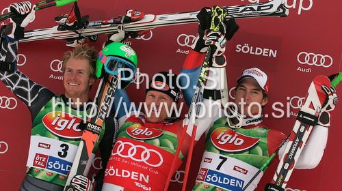 : Winner Didier Cuche of Switzerland (M), second placed Ted Ligety of USA (L) and third placed Carlo Janka of Switzerland (R) celebrate their medals won in first Women GS FIS Alpine ski World Cup 2009-2010 race in Soelden, Austria. First giant slalom race of Men FIS Alpine ski World Cup was held on Rettenbach glacier above Soelden, Austria on 25th of October 2009.