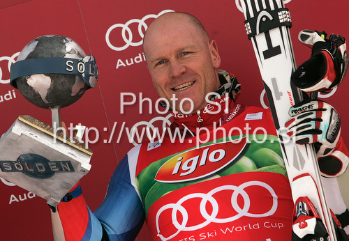 Soelden ,Austria - 25.10.2009 : Winner Didier Cuche of Switzerland celebrates his medal won in first Women GS FIS Alpine ski World Cup 2009-2010 race in Soelden, Austria. First giant slalom race of Men FIS Alpine ski World Cup was held on Rettenbach glacier above Soelden, Austria on 25th of October 2009. Photo by: Primoz Jeroncic