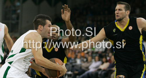 Ljubljana ,Slovenia - 29.10.2009 : Sani Becirovic of Union Olimpija (L) and Samon Alfred Lucas (M) and Jared Homan (R) of Maroussi BC during match of Basketball Euroleague between Union Olimpija, Ljubljana, Slovenia and Maroussi BC, Athens, Greece. Match between Union Olimpija and Maroussi BC was played on 29th of October 2009 in Tivoli Arena in Ljubljana, Slovenia. Photo by: Primoz Jeroncic