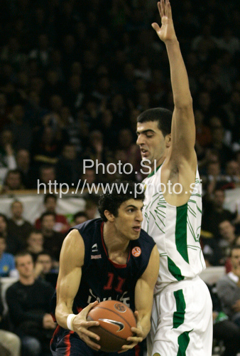 : Lior Eliyahu (no.11) of Caja Laboral (L) and Edin Bavcic (no.9) of Union Olimpija (R) during match of Basketball Euroleague between Union Olimpija, Ljubljana, Slovenia and Caja Laboral, Vitoria, Spain. Match between Union Olimpija and Caja Laboral was played on 5th of November 2009 in Tivoli Arena in Ljubljana, Slovenia.