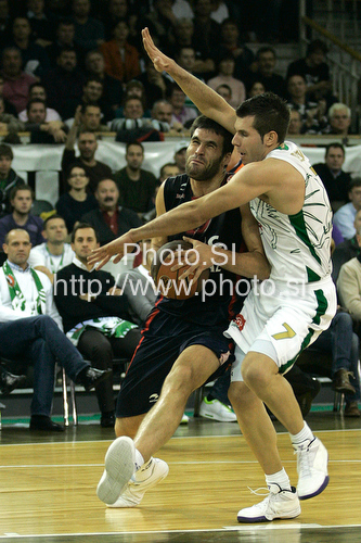 Ljubljana ,Slovenia - 05.11.2009 : Fernando San Emeterio (no.19) of Caja Laboral (L) and Sani Becirovic (no.7) of Union Olimpija (R) during match of Basketball Euroleague between Union Olimpija, Ljubljana, Slovenia and Caja Laboral, Vitoria, Spain. Match between Union Olimpija and Caja Laboral was played on 5th of November 2009 in Tivoli Arena in Ljubljana, Slovenia. Photo by: Primoz Jeroncic