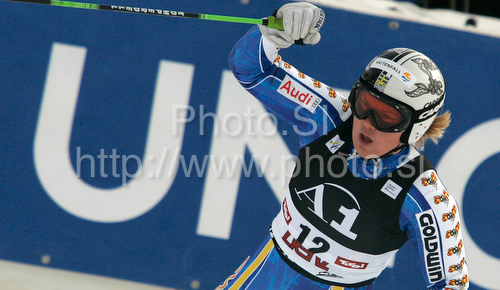 : Anja Paerson of Sweden reacts in finish of second run of women giant slalom World Cup race in Lienz, Austra. Giant slalom race of Women Audi FIS Alpine skiing World Cup 2009-10 was held in Lienz, Slovenia, on 28th of December 2009.