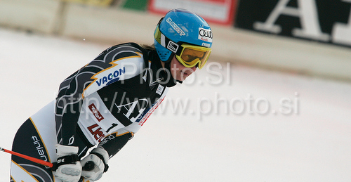 : Tanja Poutiainen of Finland reacts in finish of second run of women giant slalom World Cup race in Lienz, Austra. Giant slalom race of Women Audi FIS Alpine skiing World Cup 2009-10 was held in Lienz, Slovenia, on 28th of December 2009.