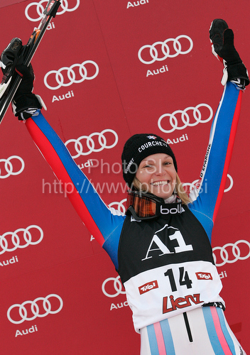 : Third placed Taina Barioz of France celebrates her medal won in women giant slalom World Cup race in Lienz, Austra. Giant slalom race of Women Audi FIS Alpine skiing World Cup 2009-10 was held in Lienz, Slovenia, on 28th of December 2009.