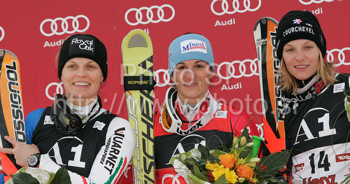 : Winner Kathrin Hoelzl of Germany (M), second placed Manuela Moelgg of Italy (L) and third placed Taina Barioz of France (R) celebrate their medals won in women giant slalom World Cup race in Lienz, Austra. Giant slalom race of Women Audi FIS Alpine skiing World Cup 2009-10 was held in Lienz, Slovenia, on 28th of December 2009.