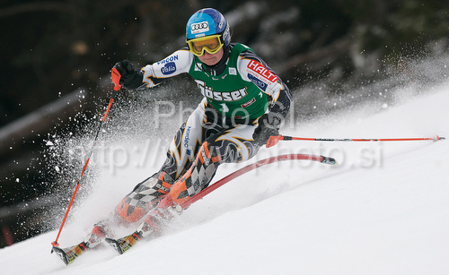 : Third after first run Tanja Poutiainen of Finland skiing in first run of women slalom World Cup race in Lienz, Austra. Slalom race of Women Audi FIS Alpine skiing World Cup 2009-10 was held in Lienz, Austria, on 29th of December 2009.