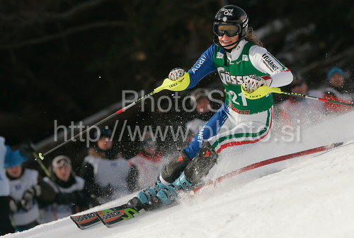 : Manuela Moelgg of Italy skiing in first run of women slalom World Cup race in Lienz, Austra. Slalom race of Women Audi FIS Alpine skiing World Cup 2009-10 was held in Lienz, Austria, on 29th of December 2009.