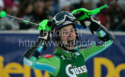 : Fourth placed Tina Maze of Slovenia reacts in finish of second run of women slalom World Cup race in Lienz, Austra. Slalom race of Women Audi FIS Alpine skiing World Cup 2009-10 was held in Lienz, Austria, on 29th of December 2009.