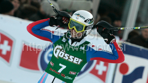 : Second placed Sandrine Aubert of France reacts in finish of second run of women slalom World Cup race in Lienz, Austra. Slalom race of Women Audi FIS Alpine skiing World Cup 2009-10 was held in Lienz, Austria, on 29th of December 2009.