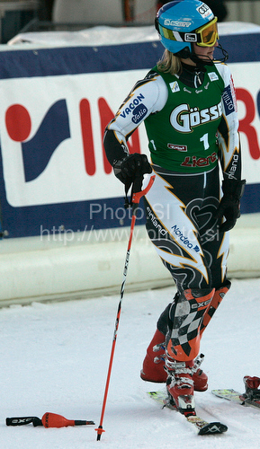 : Tanja Poutiainen of Finland reacts in finish of second run of women slalom World Cup race in Lienz, Austra, after she lost her third place after second run due broken pole. Slalom race of Women Audi FIS Alpine skiing World Cup 2009-10 was held in Lienz, Austria, on 29th of December 2009.