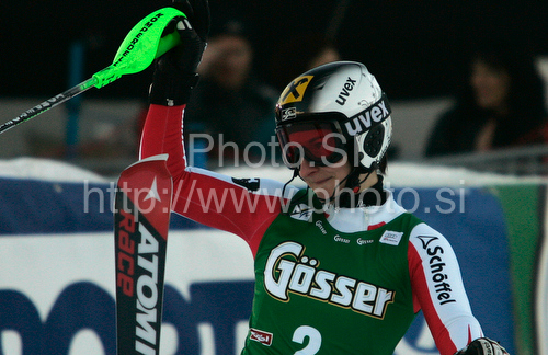 : Third placed Kathrin Zettel of Austria reacts in finish of second run of women slalom World Cup race in Lienz, Austra. Slalom race of Women Audi FIS Alpine skiing World Cup 2009-10 was held in Lienz, Austria, on 29th of December 2009.
