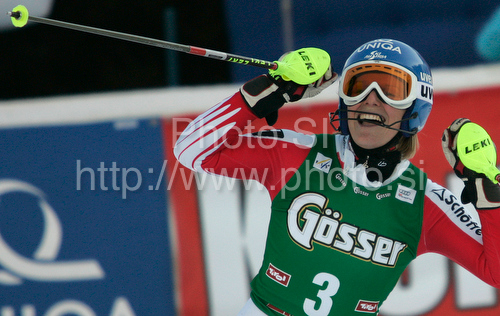 Lienz ,Austria - 29.12.2009 : Winner Marlies Schild of Austria reacts in finish of second run of women slalom World Cup race in Lienz, Austra. Slalom race of Women Audi FIS Alpine skiing World Cup 2009-10 was held in Lienz, Austria, on 29th of December 2009. Photo by: Primoz Jeroncic