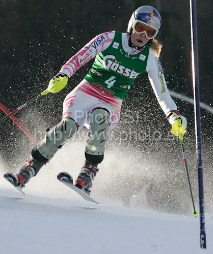 : Lindsey Vonn of USA skiing in second run of women slalom World Cup race in Lienz, Austra. Slalom race of Women Audi FIS Alpine skiing World Cup 2009-10 was held in Lienz, Austria, on 29th of December 2009.