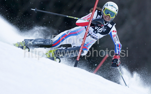 Zagreb ,Croatia - 03.01.2010 : Fourth placed after first run, Sandrine Aubert of France skiing in first run of women Snow queen trophy slalom World Cup race in Zagreb, Croatia. Slalom race of Women Audi FIS Alpine skiing World Cup 2009-10 was held in on Sljeme above Zagreb, Croatia, on 3rd of January 2010. Photo by: Primoz Jeroncic