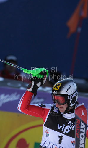Zagreb ,Croatia - 03.01.2010 : Second placed Kathrin Zettel of Austria reacts in finish of second run of women Snow queen trophy slalom World Cup race in Zagreb, Croatia. Slalom race of Women Audi FIS Alpine skiing World Cup 2009-10 was held in on Sljeme above Zagreb, Croatia, on 3rd of January 2010. Photo by: Primoz Jeroncic