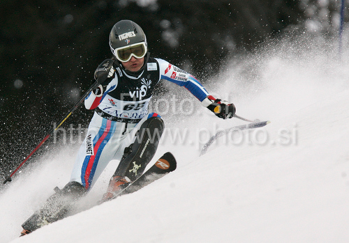 : Anemone Marmottan of France skiing in first run of women Snow queen trophy slalom World Cup race in Zagreb, Croatia. Slalom race of Women Audi FIS Alpine skiing World Cup 2009-10 was held in on Sljeme above Zagreb, Croatia, on 3rd of January 2010.