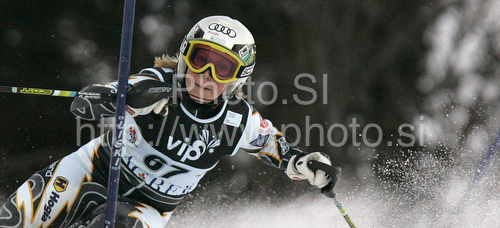 : Tii-Maria Romar of Finland skiing in first run of women Snow queen trophy slalom World Cup race in Zagreb, Croatia. Slalom race of Women Audi FIS Alpine skiing World Cup 2009-10 was held in on Sljeme above Zagreb, Croatia, on 3rd of January 2010.