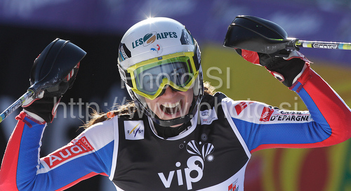 : Winner Sandrine Aubert of France reacts in finish of second run of women Snow queen trophy slalom World Cup race in Zagreb, Croatia. Slalom race of Women Audi FIS Alpine skiing World Cup 2009-10 was held in on Sljeme above Zagreb, Croatia, on 3rd of January 2010.