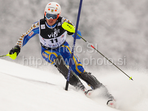 : Andre Myhrer of Sweden skiing in first run of men Snow queen trophy slalom World Cup race in Zagreb, Croatia. Slalom race of Men Audi FIS Alpine skiing World Cup 2009-10 was held on Sljeme above Zagreb, Croatia, on 6th of January 2010.