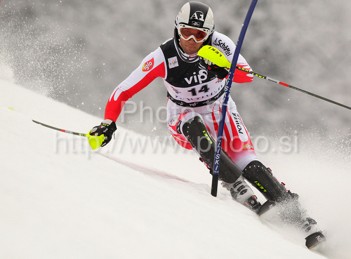 : Fourth after first run Mario Matt of Austria skiing in first run of men Snow queen trophy slalom World Cup race in Zagreb, Croatia. Slalom race of Men Audi FIS Alpine skiing World Cup 2009-10 was held on Sljeme above Zagreb, Croatia, on 6th of January 2010.