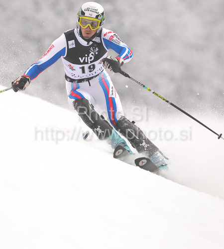 : Sixth after first run Steve Missillier of France skiing in first run of men Snow queen trophy slalom World Cup race in Zagreb, Croatia. Slalom race of Men Audi FIS Alpine skiing World Cup 2009-10 was held on Sljeme above Zagreb, Croatia, on 6th of January 2010.