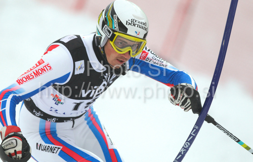 : Sixth after first run Steve Missillier of France skiing in first run of men Snow queen trophy slalom World Cup race in Zagreb, Croatia. Slalom race of Men Audi FIS Alpine skiing World Cup 2009-10 was held on Sljeme above Zagreb, Croatia, on 6th of January 2010.