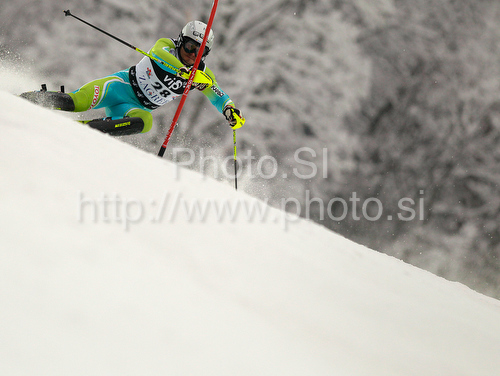 : Mitja Dragsic of Slovenia skiing in first run of men Snow queen trophy slalom World Cup race in Zagreb, Croatia. Slalom race of Men Audi FIS Alpine skiing World Cup 2009-10 was held on Sljeme above Zagreb, Croatia, on 6th of January 2010.