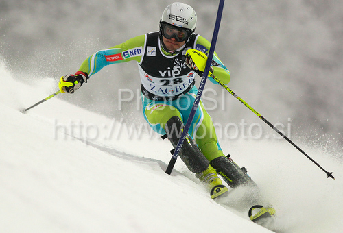 : Mitja Dragsic of Slovenia skiing in first run of men Snow queen trophy slalom World Cup race in Zagreb, Croatia. Slalom race of Men Audi FIS Alpine skiing World Cup 2009-10 was held on Sljeme above Zagreb, Croatia, on 6th of January 2010.